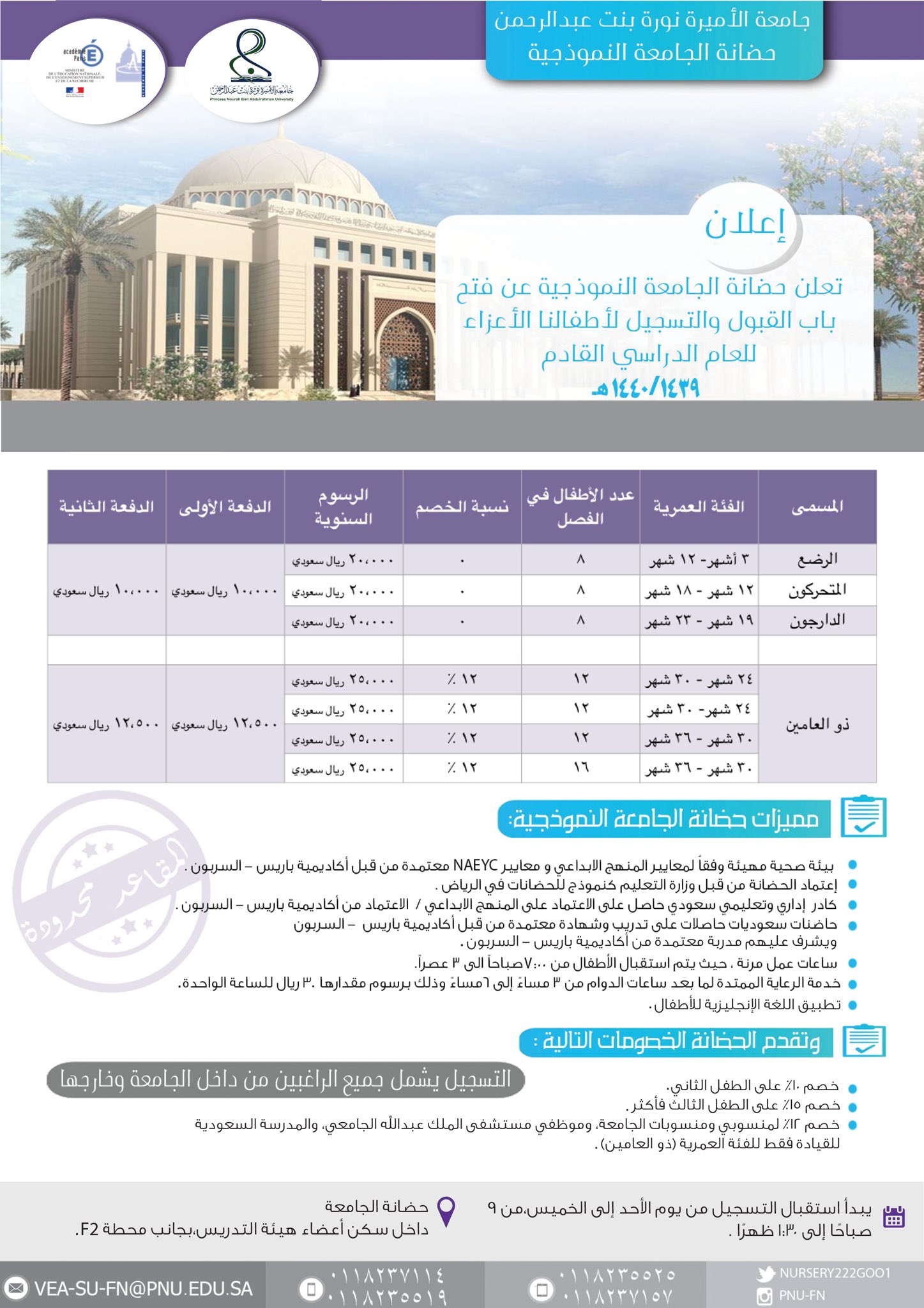 o xrhsths جامعة الأميرة نورة sto twitter إعلان من حضانة الجامعة النموذجية عن فتح باب القبول والتسجيل لأطفالنا الأعزاء للعام الدراسي القادم ١٤٣٩ ١٤٤٠هـ جامعة الأميرة نورة pnu https t co bnktsuycmn