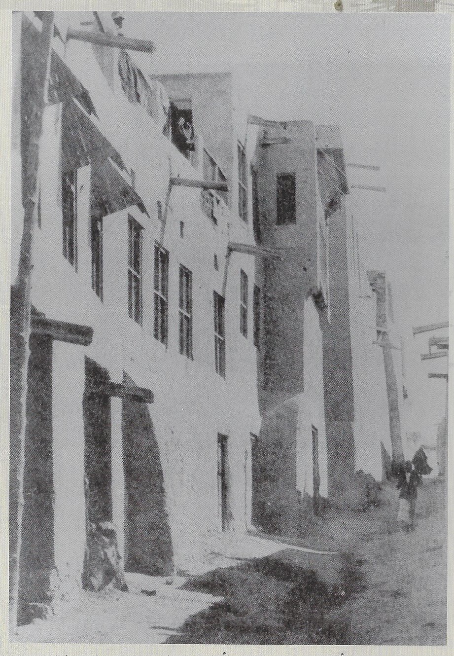 ذكريات memories on twitter صورة للمنازل في الكويت في فترة بين الثلاثينات والخمسينات الميلادية ويبدو أنها تجمع بين بيوت الطين المشابهة للطريقة النجدية وشيئا من المواصفات الحجازية في البناء التي تتأقلم